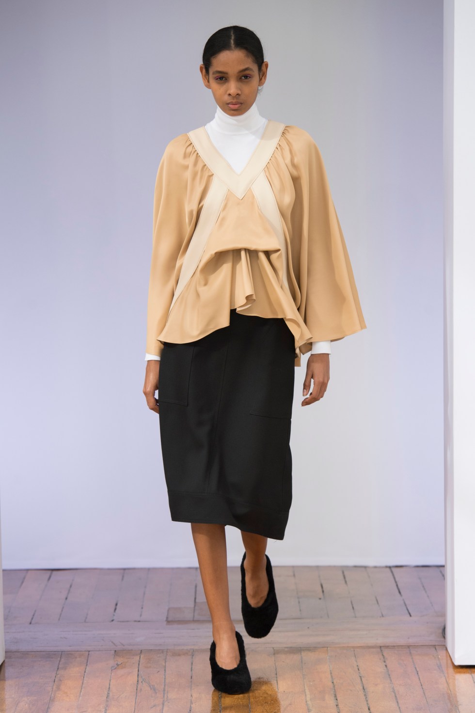 La femme CYCLAS porte un trench-coat W-Face beige à carreaux avec des manches cintrées, en attachant la ceinture ajustée à la taille créant un volume intéressant sur son dos. Sa garde-robe quotidienne correspond à un top en baby alpaga super doux vert pastel grisâtre avec un chemisier lilas et une jupe à ourlet asymétrique violet aux larges plis pour compléter le look. Elle portera une veste matelassée surdimensionnée par-dessus une robe en maille empilée avec une jupe plissée pour la journée, col roulé blanc optique et chemisier beige assorti d’une jupe longue au sol en sergé de soie brillant pour le soir. Et quand elle choisit un chemisier organdi rose pâle avec des détails de fourrure délicates.