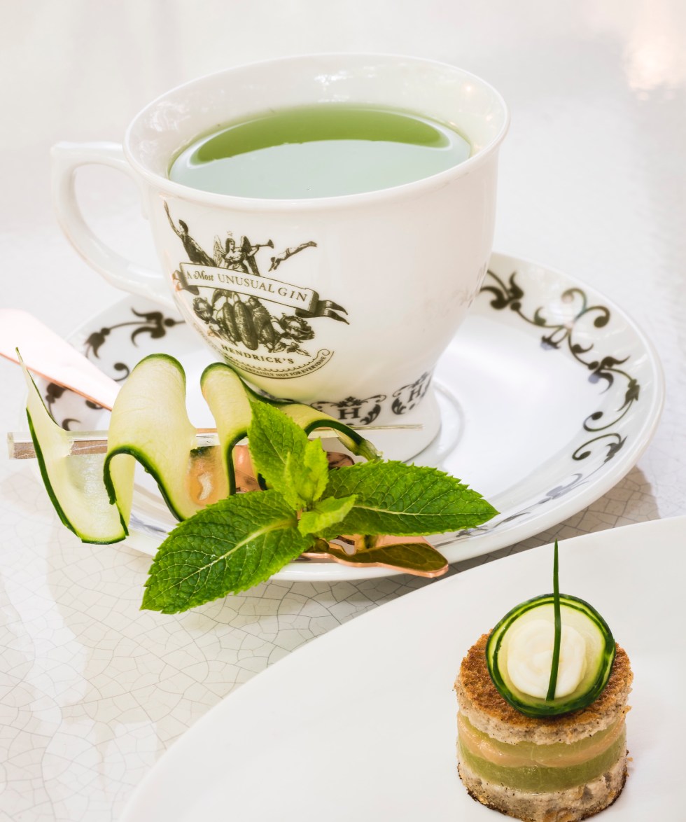 Servi dans une tasse à thé comme un clin d’œil aux origines britanniques du gin Hendrick’s, le High Garden est composé d’un semi pris de gin Hendrick’s, de chartreuse verte, de sirop de concombre, de jus de citron jaune et de bitter menthe, allongé au Champagne. Il est accompagné d’un éventail de concombre imprégné au gin, et d’un blinis de sarrasin, crème raifort et saumon fumé.