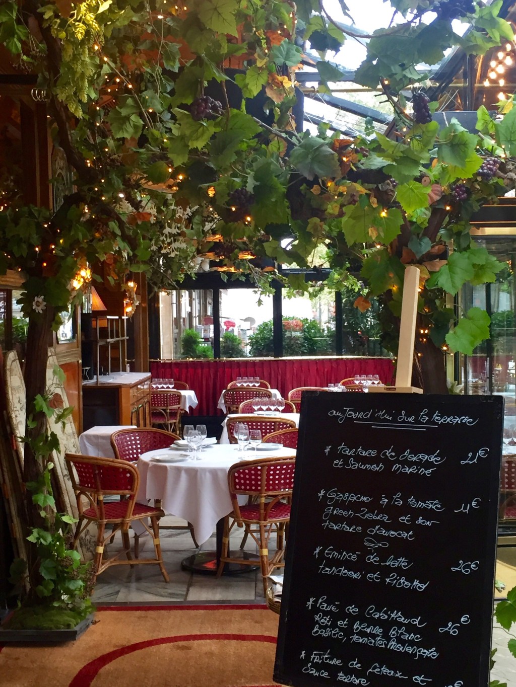 Dès l’entrée, l’immersion dans un imaginaire gourmand est immédiate. L’espace brasserie est un jardin d’été. Axel Huynh s’est inspiré de l’évanescence florale des somptueux jardins de Toscane et confie au créateur Guillaume Demont la réalisation de ce jardin imaginaire. La feuille de vigne, signature du designer est déclinée sous différentes formes et matières. Elle est le fil évocateur de l’esprit des fêtes qui y règne. Ici la nature reprend ses droits, la feuille de vigne végétale se propage pour s’entremêler délicatement à son interprétation métallique. Une installation lumineuse qui a necessité plus de 600 heures par les artisans passionnés d’Art et Floritude.