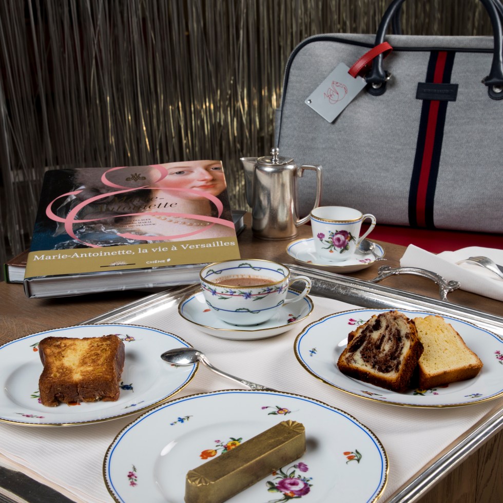 Pour l’heure du thé, les clients pourront goûter « Les Délices de Marie-Antoinette », composés d’un Gâteau marbré, d’une Brioche cloutée de chocolat et du Louis XIV, dessert signature du restaurant Ducasse au château de Versailles. Le tout est assorti d’un café ou d’un chocolat, pour accompagner ces plaisirs sucrés comme le faisait la souveraine.