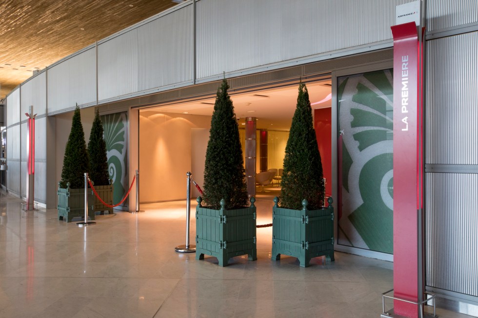 Des caisses à oranger, appartenant à la collection végétale du château de Versailles, sont exceptionnellement installées à l’entrée du vestibule du salon La Première d’Air France devant un décor évoquant les dentelles de verdure, emblématiques des jardins à la française. Ils apportent quelques notes de Versailles avant la découverte d’un salon où règnent luxe, calme et volupté.