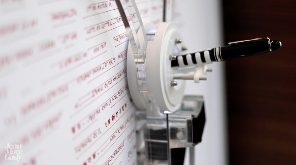 “Cette année, nous avons choisi de présenter le stylo Montblanc dans sa fonction pure : en train d’écrire. En le faisant fonctionner, et en transmettant via cette installation, l’envie et “l’Art de l’écriture”, nous avons étendu le champs des possibles. Ce writing robot porte, à son échelle, toutes les valeurs de Montblanc : la plus haute qualité d’écriture depuis 100 ans, entre héritage et modernité” explique Emilie André, responsable du studio Jean-Marc Gady et directrice de création.