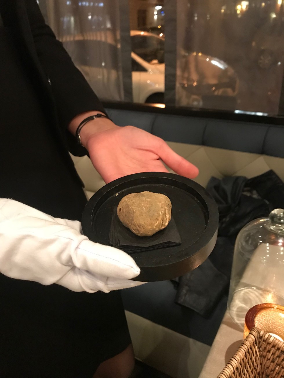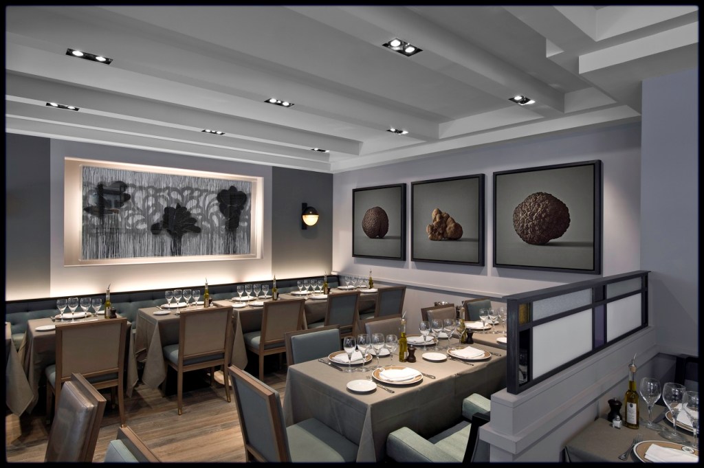 Dès l’entrée du restaurant, des effluves de truffes flottent dans l’air. Quel bonheur ! On prend place dans cette belle salle aux accents Art déco, intimiste, avec des gris ambrés prégnants et des notes cuivrées ou dorées, réalisée par le décorateur espagnol Thomas Urquijo. La carte propose une offre assez large et se décider est un vrai dilemme. Dans la salle, un mélange de touristes et de Parisiens.
