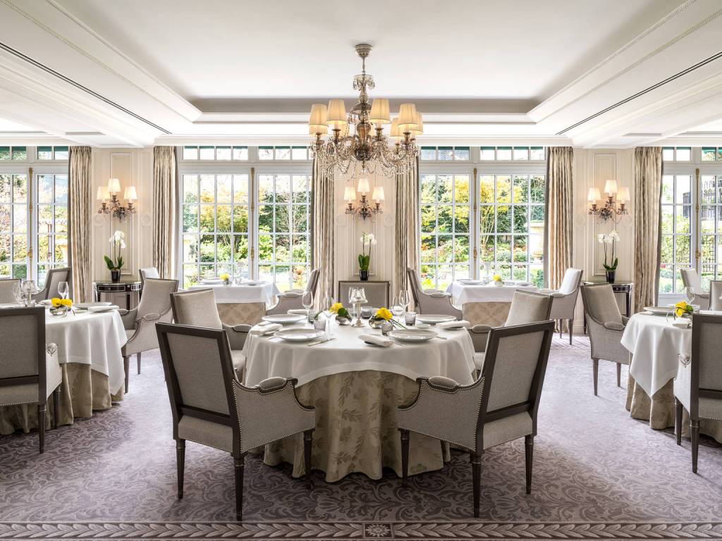 Le restaurant est presque comble un soir de semaine, début juillet. Le salle donne sur un splendide jardin à la Française. Les tables sont dressées avec précision avec une belle vaisselle dessinée par Pierre-Yves Rochon. On est bien installé, les fauteuils sont très confortables. On démarre ce dîner par une petite coupe de champagne. De belles maisons figures à la carte des vins.