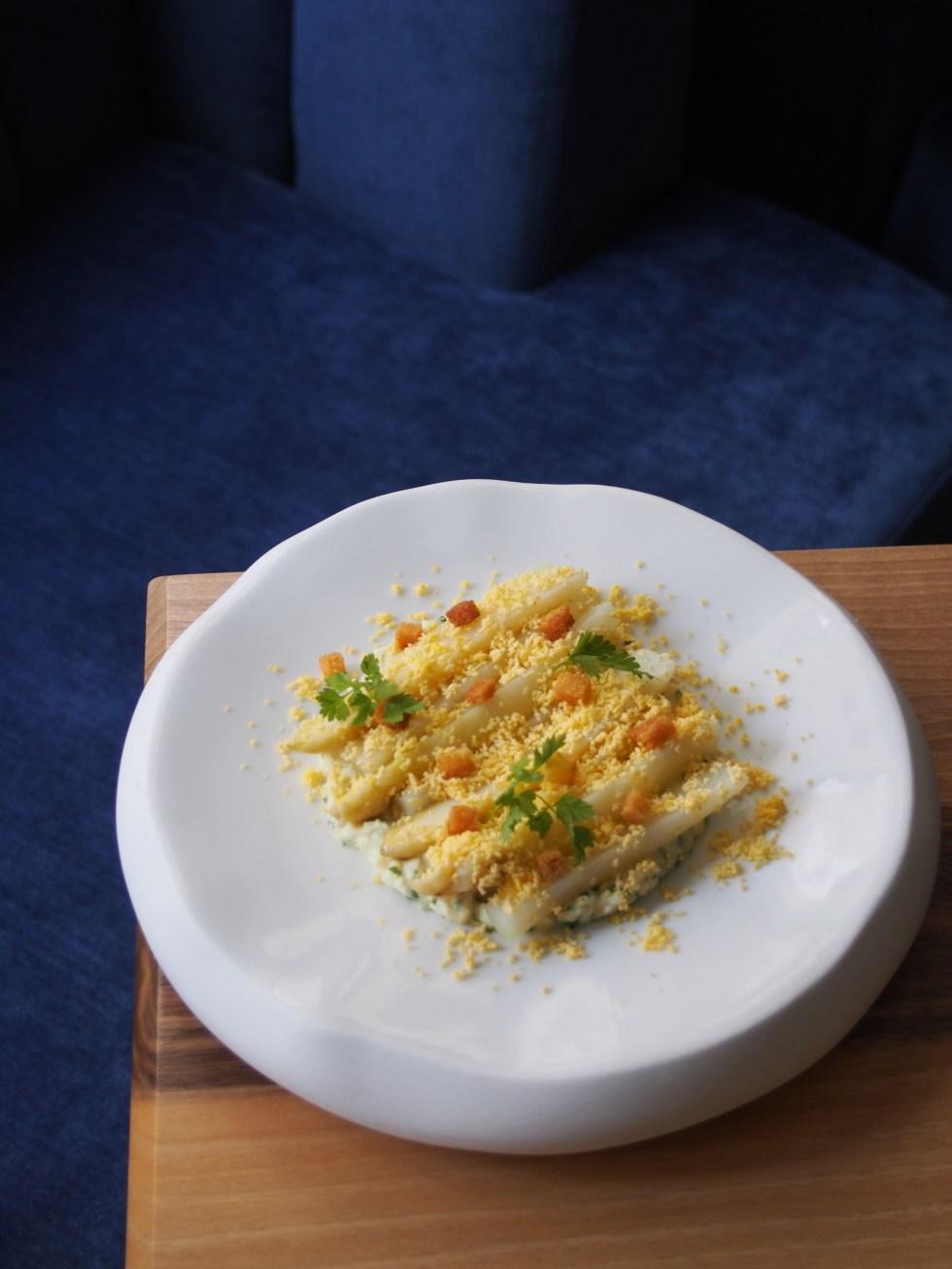 En entrée les asperges blanches d’Anjou au naturel, assaisonnées d’une huile d’olive Picual; mimosa d’œufs bio, fines herbes et petits croûtons. En plat, l’épaule d’agneau de l’Aveyron, braisée à four doux et parfumée aux épices orientales ; houmous, olives taggiasche et herbes fraîches. En dessert, le cheesecake fraises & rhubarbe, biscuit, mousse légère de cream cheese parfumée au poivre de Timut, rhubarbe pochée et fraises gariguette de Y. Colombié. Le tout à 29€ afin de rendre accessible l’extraordinaire, à ajouter à son quotidien, au bureau comme à la maison.