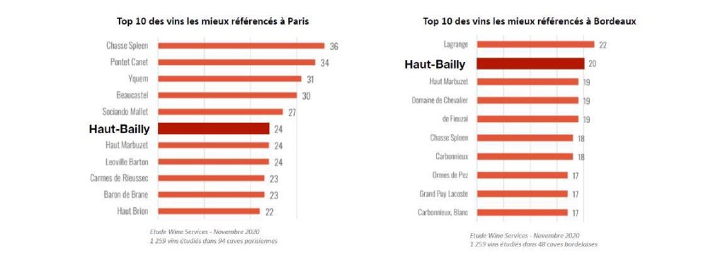 Une étude menée par Wine Services auprès de 94 cavistes à Paris et 48 à Bordeaux révèle que Haut-Bailly fait partie des 10 vins les mieux référencés parmi 1259 vins analysés.