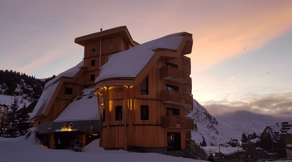 Les matériaux et les formes géométriques du bâ- timent respectent les codes de la station confon- dant ainsi le bâti avec les pentes enneigées qui l’entoure, tel un nouveau sommet. Le gris argen- té des façades en mélèzes se mêle aux tavaillons des balcons, ces tuiles de bois typiques des fa- çades et toits d’Avoriaz.