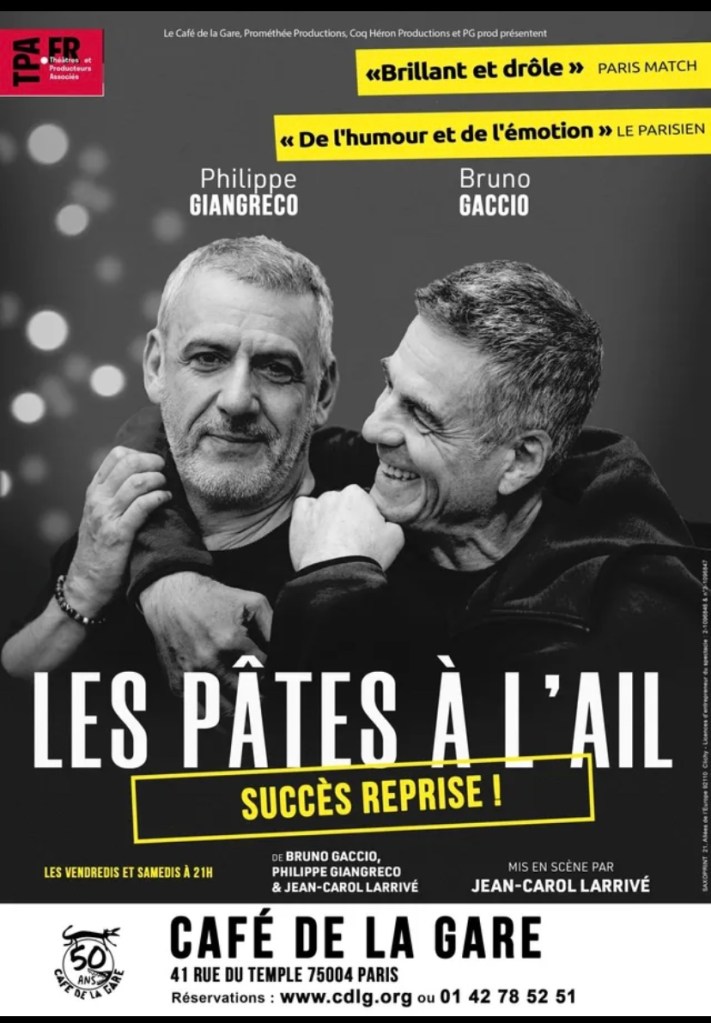 Les acteurs Bruno Gaccio, jadis plume des Guignols, et Philippe Giangrecco sont très complices. Les dialogues sont très savoureux et le décor soigné. C’est une vraie bonne surprise. On passe un bon moment dans ce café théâtre mythique parisien au sein duquel Coluche a fait ses débuts. « Les pâtes à l’ail » touchent au but. On ressort touché et revigoré. Même si le sujet est délicat, un vrai vent d’optimisme plane durant 1H30.