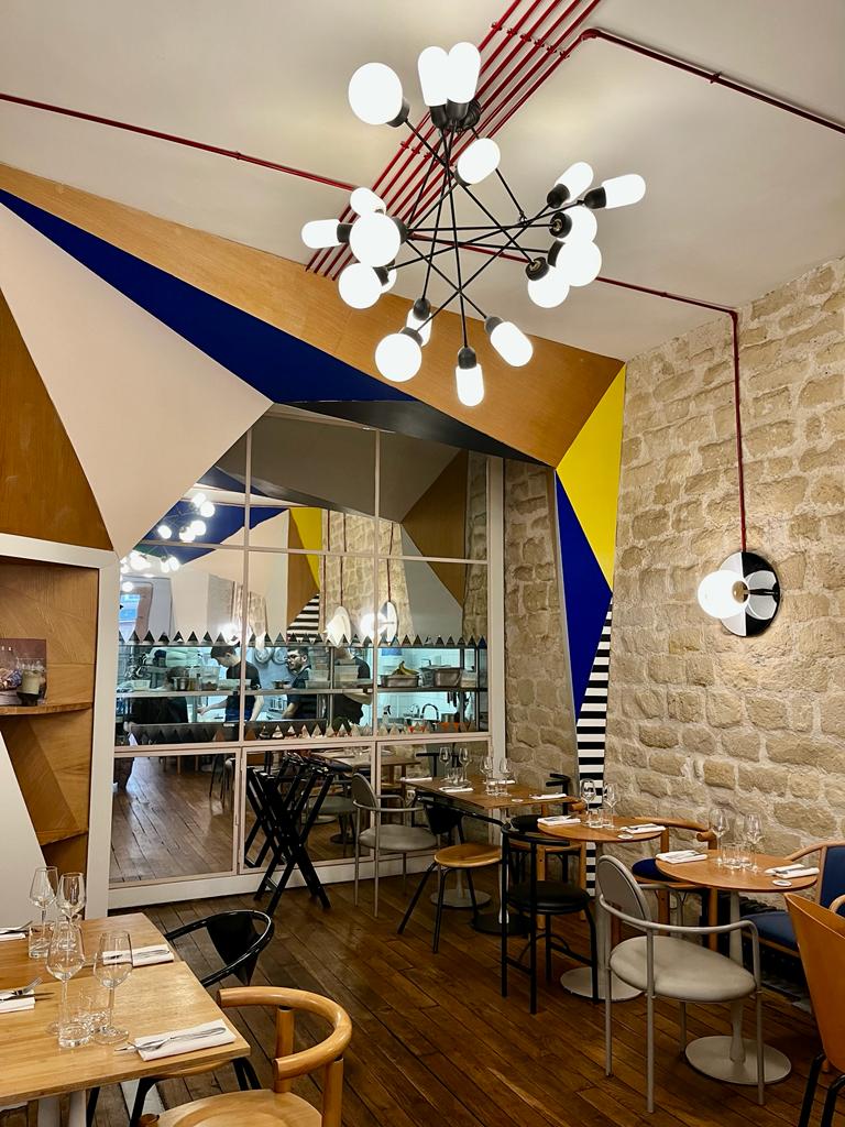 Cuisine vitrée ouverte sur la salle principale, belle hauteur sous plafond, beau parquet ancien, mobilier boisé, murs grattés, couleurs vives, rayures, symboles excentriques, inspirés par l’art-déco et le pop art : la décoration se décline autour d’un métissage de formes asymétriques. Assemblage de chaises iconiques des années 80, désignées par Philippe Starck pour Driade, Rodney Kinsman pour Padova ou Helmut Lubbke. Le lieu est très agréable, on s’y sent bien. Les tables sont assez espacées. Parfait pour prendre son temps.