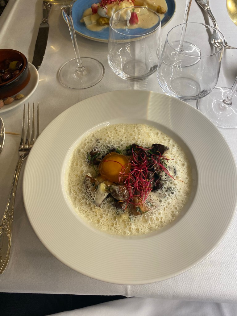 En entrée les champignons sauvages avec leur jaune d’œuf confit constitue une belle option. Les asperges blanches ou le saumon gravlax nous font aussi de l’œil.