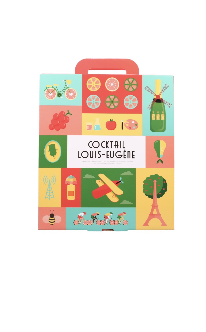 Composé de trois flacons (le Brut Sélection Pannier, le Ratafia Pannier et un jus de pamplemousse de la Maison Patrick Font), le coffret renferme la fameuse recette du cocktail LOUIS-EUGÈNE.
