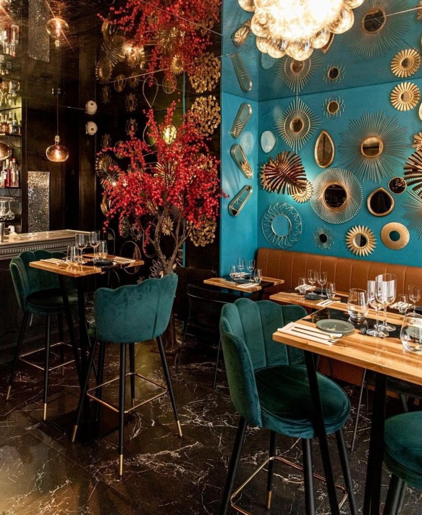 Si l’assiette est sompteuse, la déco n’est pas en reste! le style néo-art déco parsemé d’influences orientales, confère au lieu une atmosphère cosy. La restauratrice a souhaité une accumulation de miroirs dorés, chinés ça et là dans le shouk de Tel Aviv ou en brocantes.