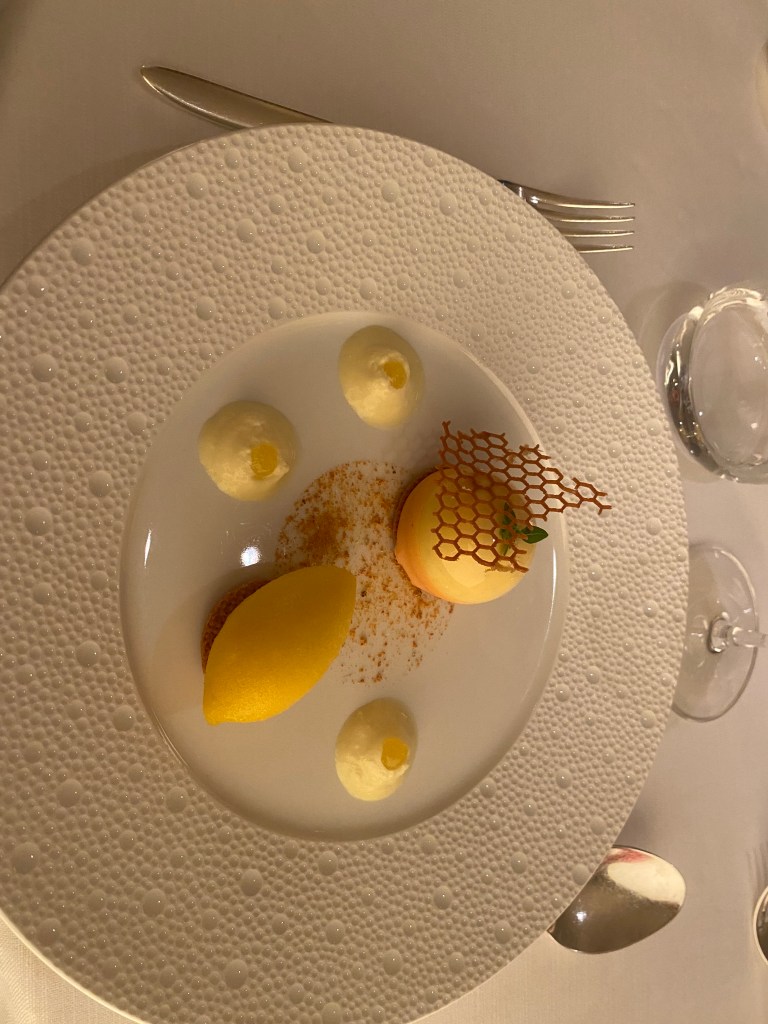 En dessert, les pommes tatin à la pâte phyllo caramélisée, à la crème légère aux épices et se marient à la glace aux noix. Le chocolat est parfumé d’olive et basilic, assorti de kumquat confit et de glace à la fleur d’oranger. Une tartelette aux agrumes et son crémeux à la pistache est relevée d’une marmelade, et adoucie de glace pistache.