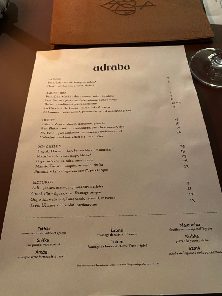 Pour les desserts, Adraba se distingue en évitant les conventions. Pour terminer votre festin en beauté, « Asli » est un yaourt divinement parfumé au zaatar et aux pignons caramélisés. « Crack Pie » est une création gourmande à base de figues, de doa, et de fromage turc. « Gogo’im » est une délicieuse combinaison d’abricot, de limonarak, de fenouil et de verveine. Enfin, « Tarte Ultime » est une création chocolatée irrésistible à la cardamome.
