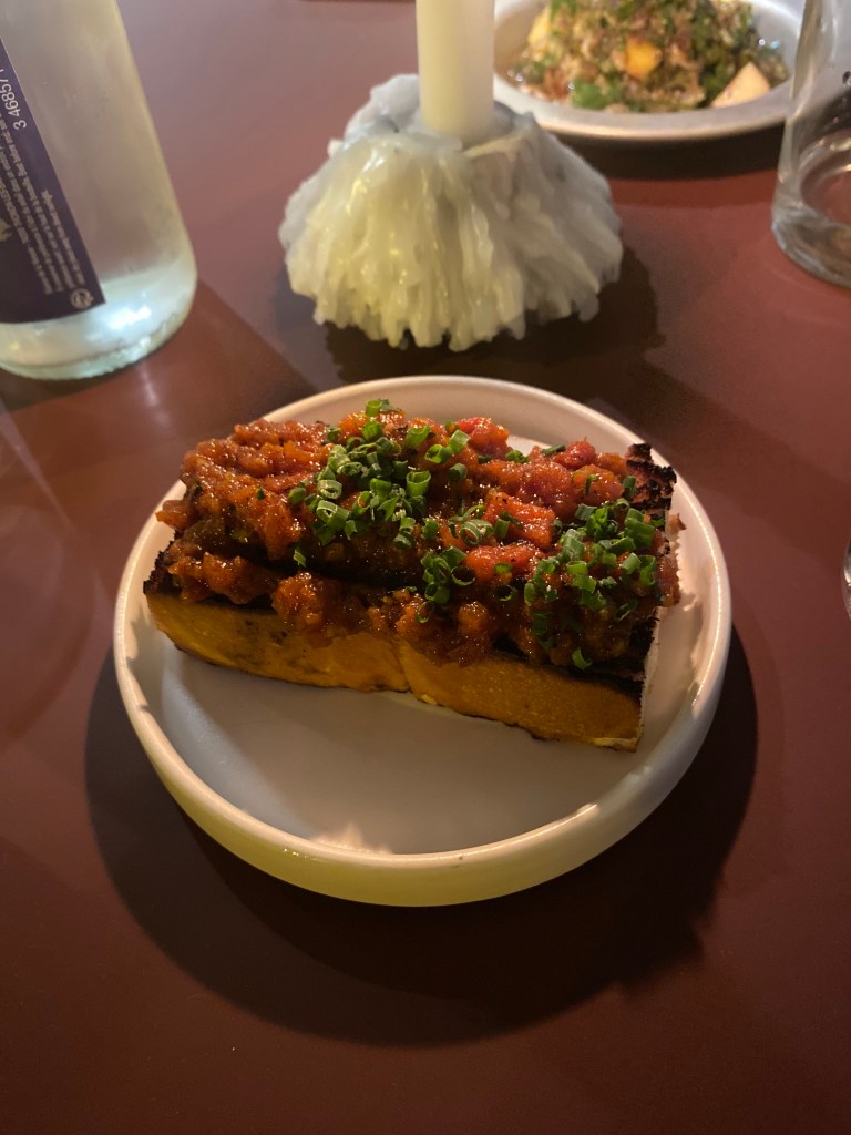 Le « Tabula Rasa » avec du taboulé, des nectarines et des pistaches est un délice, ou la « Bat-Sheva » avec du melon, du concombre, des branches, du tulum et du doa. Si vous avez un penchant pour les saveurs plus audacieuses, essayez « Ma Foie » avec du pâté ashkénaze, de la moutarde et des cornichons au sel, ou « Celerimi » avec du sashimi, du céleri sous quatre formes différentes, et des cacahuètes.
