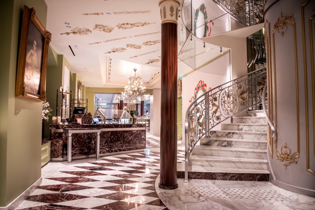 La décoration, élégamment repensée, marie le flamboyant du Second Empire à la modernité du marbre Rosso Lepanto et des touches de laiton. Les couleurs emblématiques de la maison, le vert Ladurée, le rose et le bleu pastel, créent une atmosphère sophistiquée.