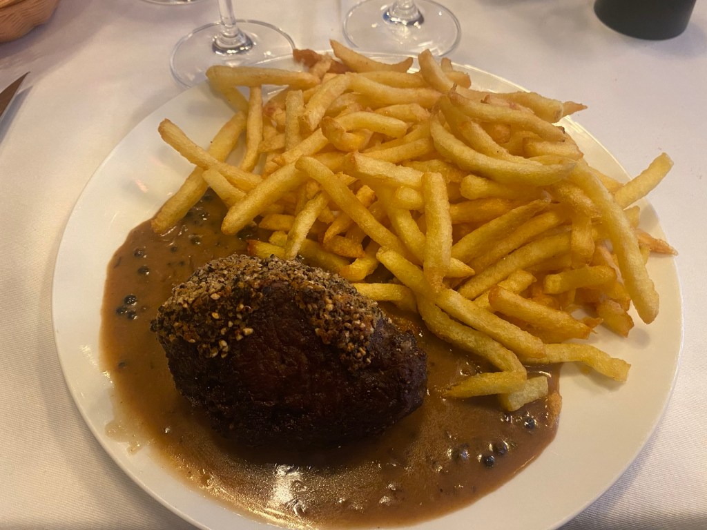 Le menu, un véritable hymne à la gourmandise, dévoile des trésors tels que le crottin de chèvre chaud juste divin, des œufs mayonnaises, un parmentier de confit de canard à l’estragon, et un filet de bœuf en croûte de poivre avec des frites fraîches, pour n’en nommer que quelques-uns.