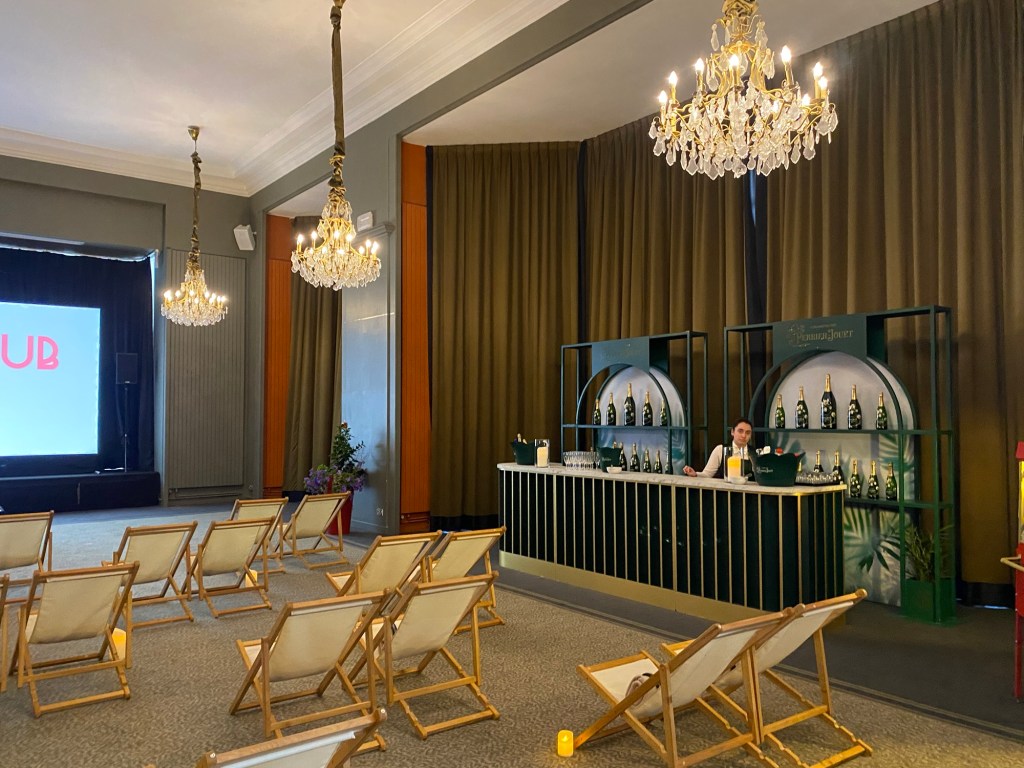 L’expérience ne s’arrête pas au cinéma : un bar à champagne Perrier-Jouët permet de siroter une coupe. Des gourmandises et confiseries sont aussi à disposition, distribuées par des grooms avec un panier en osier. L’incontournable machine à pop-corn vient parfaire cette immersion cinématographique, qui ravit petits et grands. Cet événement fut très réussi !