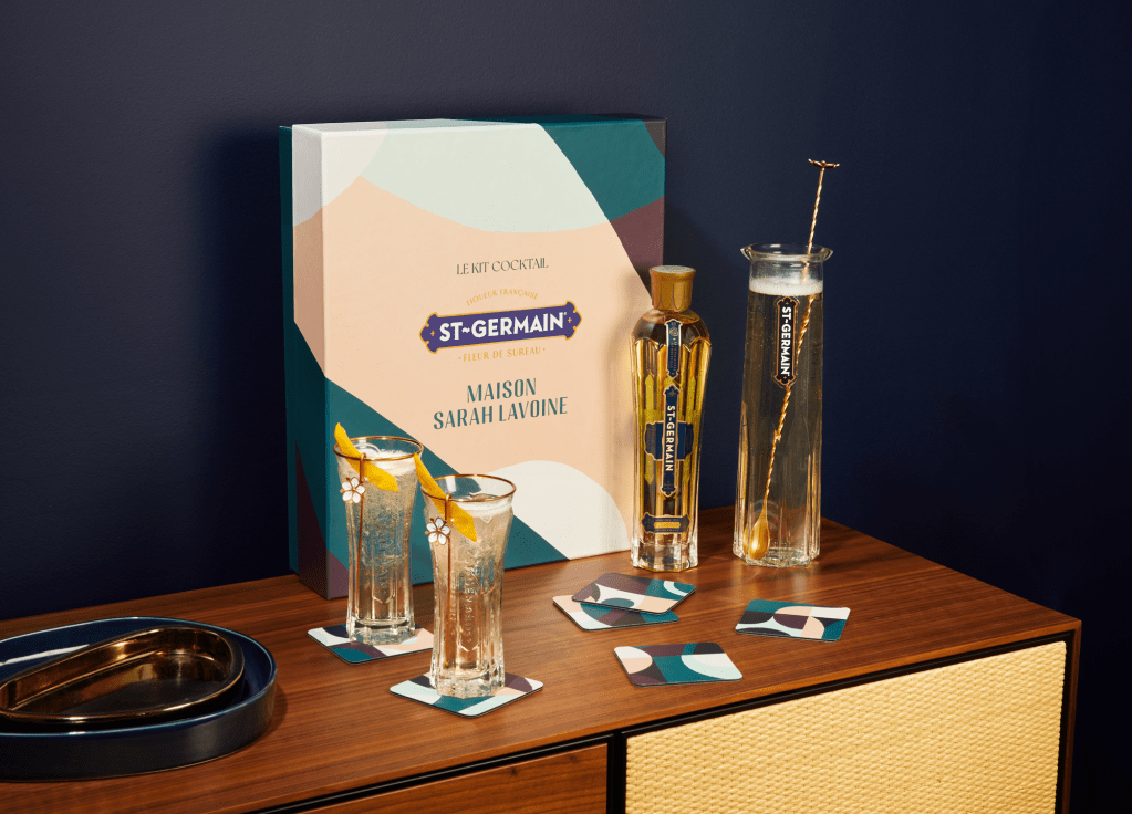 La rencontre entre ces deux univers s’est traduite par la création d’un coffret unique, pensé pour sublimer l’art de recevoir à la française. Le coffret, disponible en 400 exemplaires seulement, inclut une bouteille de liqueur St-Germain de 50 cl, une carafe à Spritz accompagnée d’une cuillère à mélange dorée, ainsi que six dessous de verre aux motifs géométriques inspirés des années 70, dessinés par Sarah Poniatowski, fondatrice et directrice artistique de Maison Sarah Lavoine.