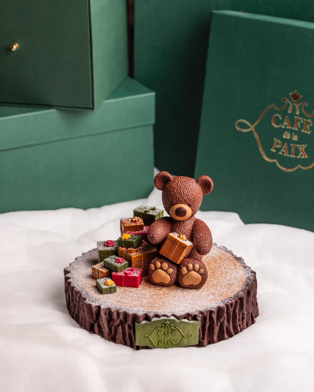 Entouré de petits cadeaux à croquer, cet ourson gourmand promet de séduire petits et grands, offrant une douce parenthèse avant l’arrivée tant attendue du Père Noël. Cette bûche festive, à la fois élégante et régressive, est une invitation à revivre les plaisirs simples et sucrés de l’enfance, tout en savourant une pâtisserie haut de gamme.