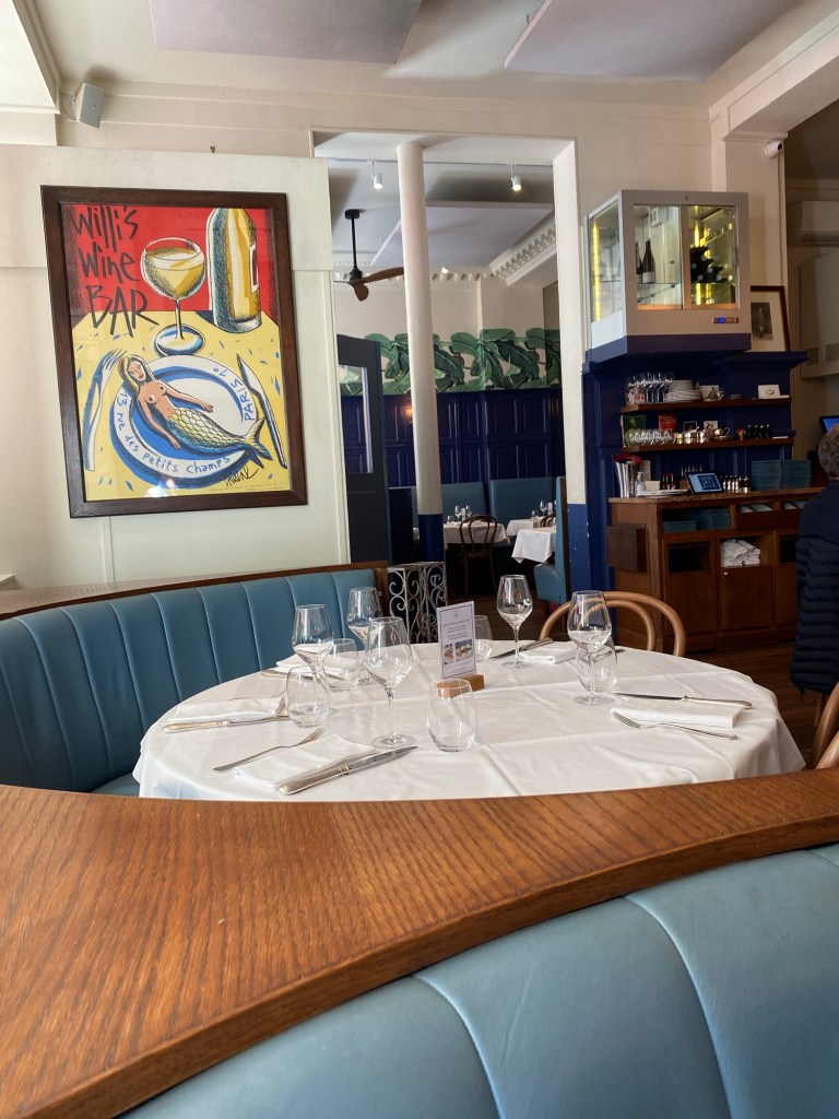 Le cadre de la brasserie, avec ses tons bleutés, ses banquettes élégantes et ses lambris soignés, offre une atmosphère à la fois feutrée et chic, rappelant les grandes brasseries de Mayfair à Londres.