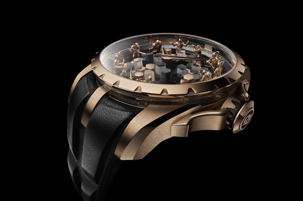 Douze chevaliers, sculptés en or rose avec une précision microscopique, semblent défendre chaque heure du cadran. Ces personnages de 6 mm, gravés à la main, prennent vie grâce à un niveau de détail saisissant : leurs armures, leurs armes et leurs poses distinctes projettent un sentiment d’énergie et de puissance. Leurs silhouettes, patinées en noir, captent subtilement la lumière et renforcent l’impression de profondeur et de réalisme.