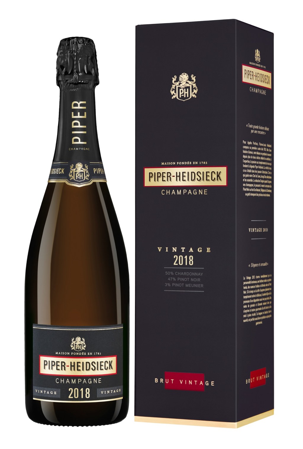 Le Vintage 2018 se distingue par sa robe dorée et ses arômes complexes : nectarine, fruits rouges, moka et une pointe d’amande fraîche. En bouche, l’intensité des fruits – framboise, ananas – s’harmonise avec une minéralité élégante et une subtile note de piment d’Espelette. La finale est longue, fraîche et ciselée, signature du style Piper-Heidsieck.