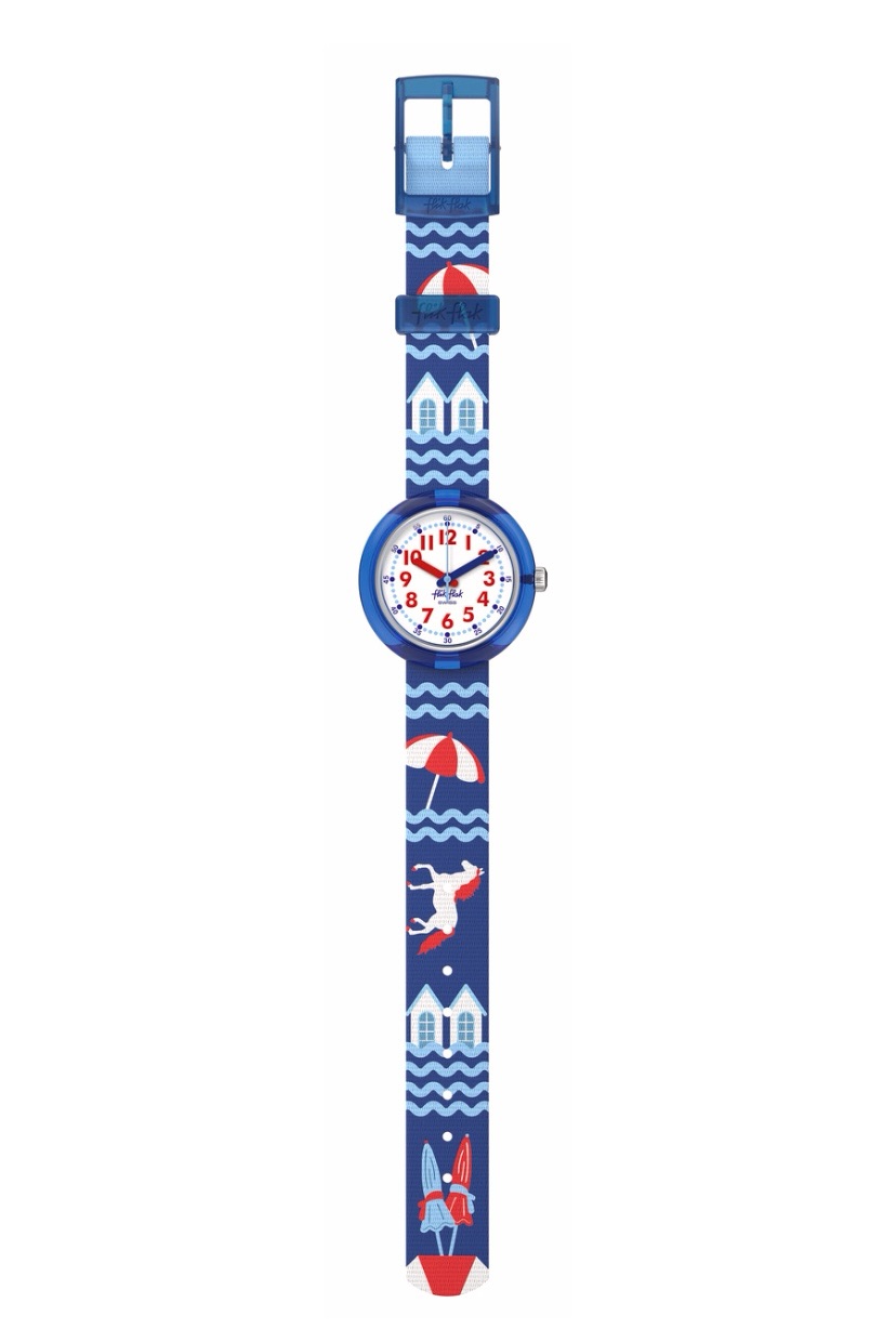 Ville de légende où se croisent élégance et art de vivre, Deauville se voit aujourd’hui sublimée par Flik Flak à travers une montre au design délicatement pensé. Son bracelet en textile PET recyclé est une véritable carte postale : parasols colorés, vagues ondulantes et chevaux galopant sur la plage rappellent les images iconiques de la station normande. Le boîtier et la boucle biosourcés d’un bleu profond évoquent quant à eux l’infini de l’océan.