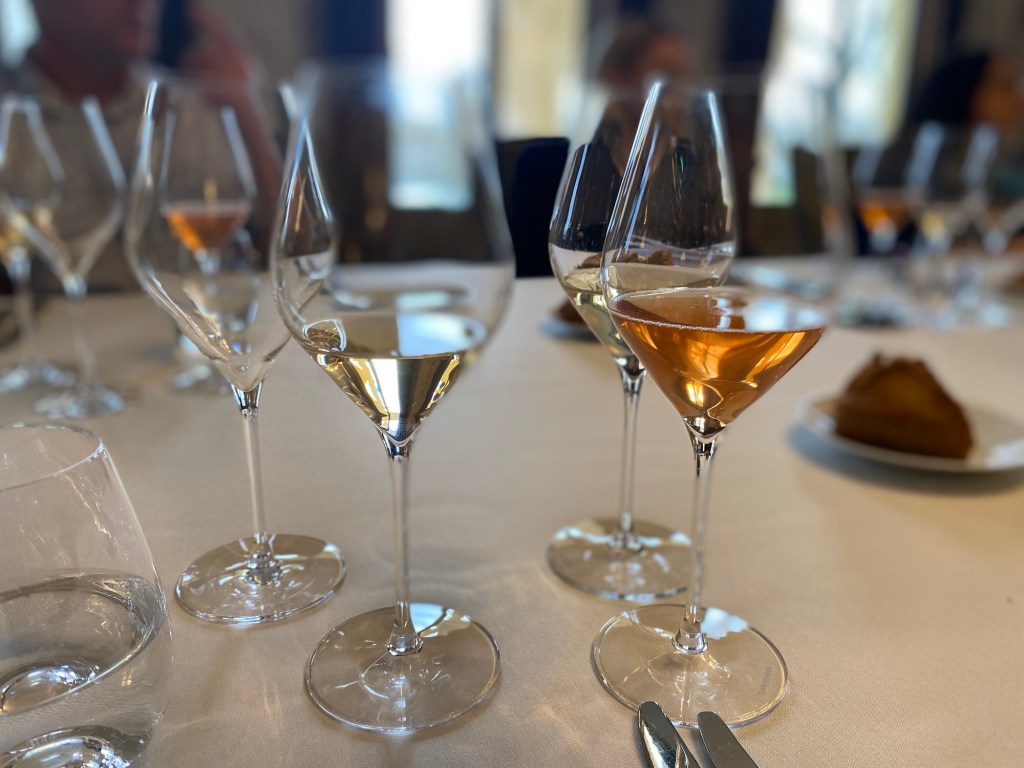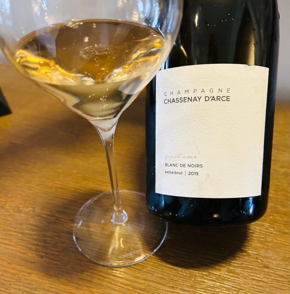 Avant même de passer à table, l’apéritif donnait le ton avec le Chassenay d’Arce Blanc de Noirs Extra-Brut 2015. Issu de la Côte des Bar, ce 100 % Pinot Noir illustre à merveille le style de la maison : puissance maîtrisée, maturité du fruit et une trame minérale qui structure l’ensemble.