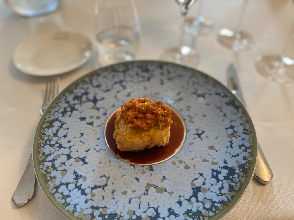 Face à lui, un plat audacieux : ris de veau croustillant, rougail épicé et jus tranché. Ici, l’enjeu est de trouver le point d’équilibre entre le gras du ris de veau et la tension du champagne.