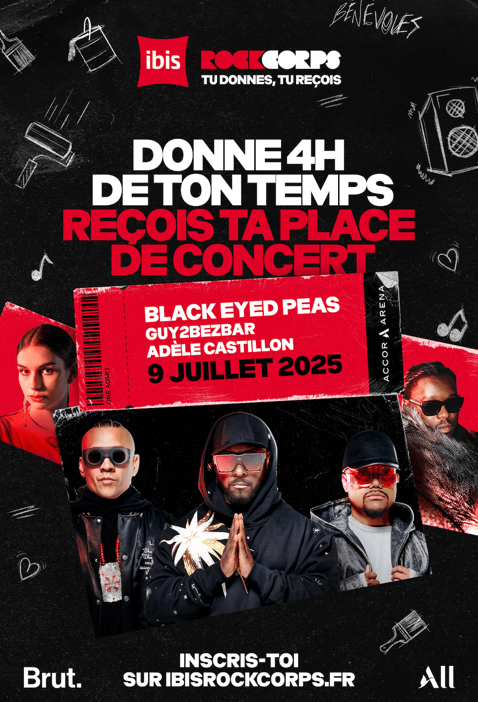 Après une édition 2024 qui a fait vibrer plus de 13 000 bénévoles, ibis RockCorps remet le couvert cette année avec une promesse intacte : mêler engagement solidaire et expérience musicale exclusive. Le concept reste simple et puissant – “Tu donnes, tu reçois”. En échange de 4 heures consacrées à une action bénévole, les participants décrochent leur place pour un concert exceptionnel. Et cette année, l’affiche frappe fort : Black Eyed Peas, Guy2Bezbar, Adèle Castillon et DJ Bens se retrouveront sur la scène de l’Accor Arena le 9 juillet 2025 pour célébrer cet élan collectif.