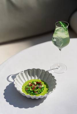 Dès l’accueil, les hôtes sont plongés dans un univers floral, avec un cocktail de bienvenue infusé des fleurs du Grand Jardin du Ritz. Puis s’enchaînent les tableaux. Petits pois, roquette et cacahuète dialoguent avec un mezcal twisté à la mandarine verte et au vétiver. L’iode d’une huître se fond dans l’écho végétal d’un breuvage à la feuille d’huître et à la bergamote. Et l’inattendu opère : le clou de girofle devient complice d’un porc Ibaïama infusé à la rose, soutenu par un cocktail pétillant aux fraises et herbes provençales.