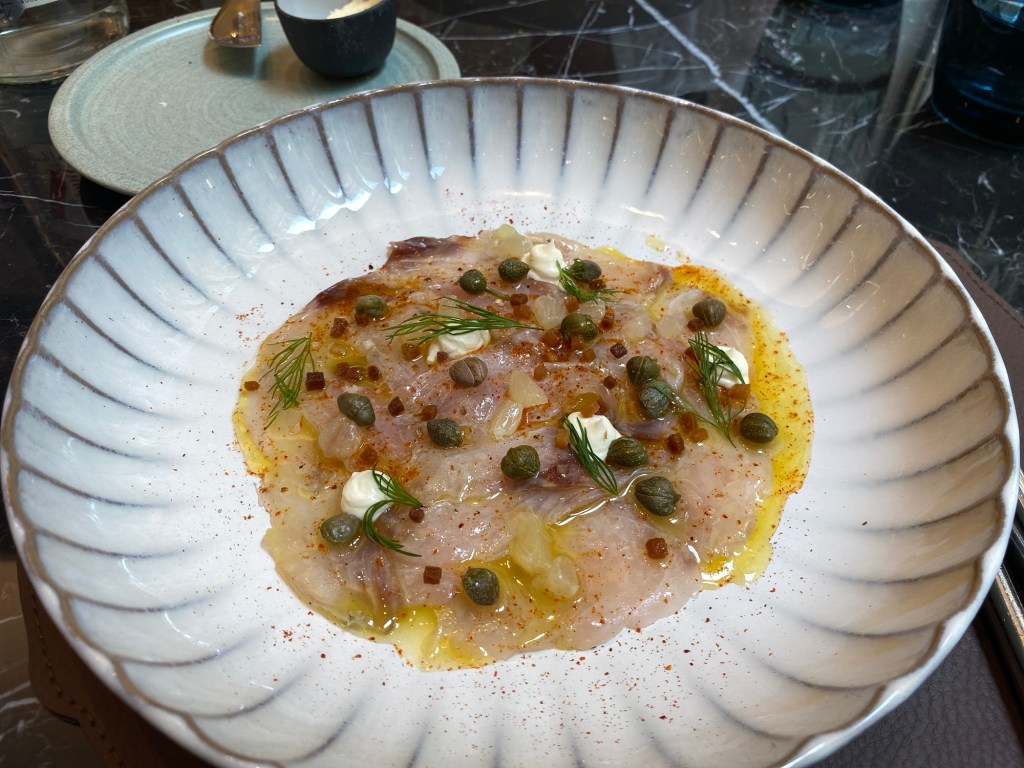 Suit un carpaccio de bar où le citron jaune répond à la rondeur saline du poisson, avec cette petite touche d’aneth qui rappelle que la simplicité, quand elle est bien faite, peut être une forme d’élégance.
