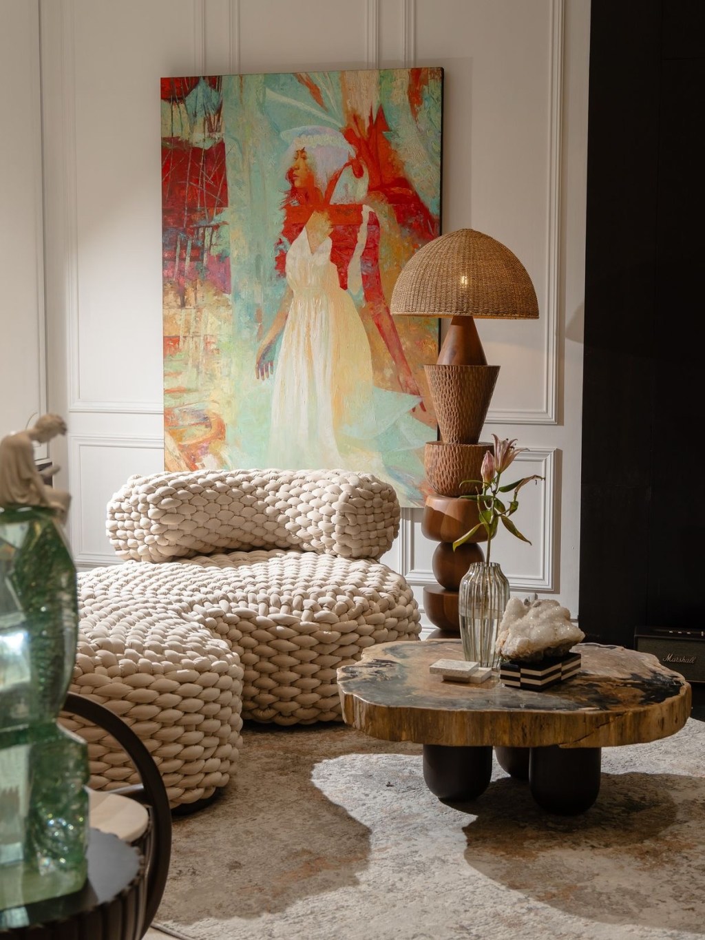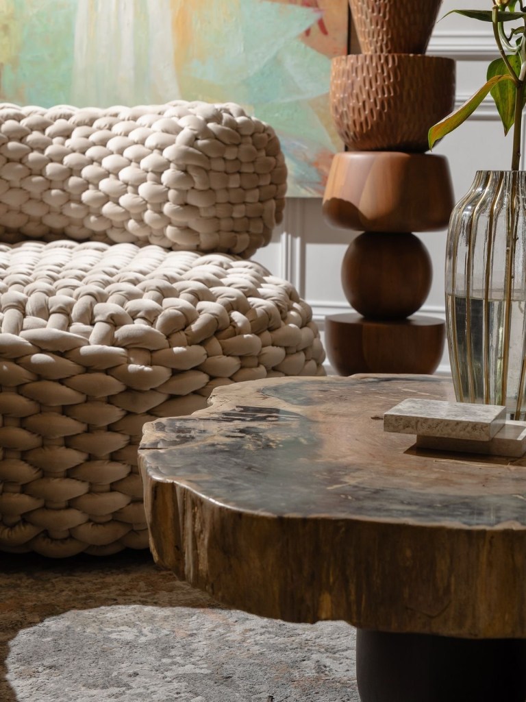 Bois massif, fibres naturelles, tissus tissés main, finitions terreuses et cuivrées : chaque matériau semble raconter une histoire.
