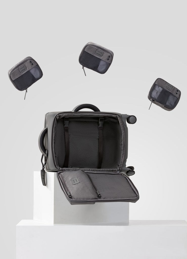 Quatre pièces emblématiques ont été revisitées : la valise cabine, le sac à dos Cargo, le masque de sommeil et l’organisateur de bagage. Des essentiels, repensés à travers les codes de la ligne Marathon Flyer de Ron Dorff, cette silhouette urbaine et sportive conçue pour accompagner les corps en mouvement.