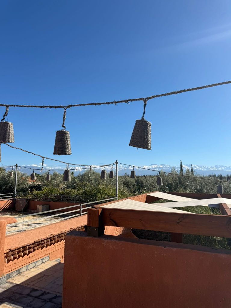 Le rooftop offre une vue spectaculaire sur les montagnes de l’Atlas. Au coucher du soleil, c’est sublime. Deux bars, des rideaux blancs, une lumière dorée… Les gens se sentent chez eux, dans un club privé où tout le monde finit par se connaître.
